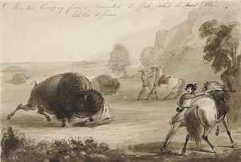 | Hunters Escaping from a Wounded Buffalo, While He Tears Their Clothes to Pieces | |