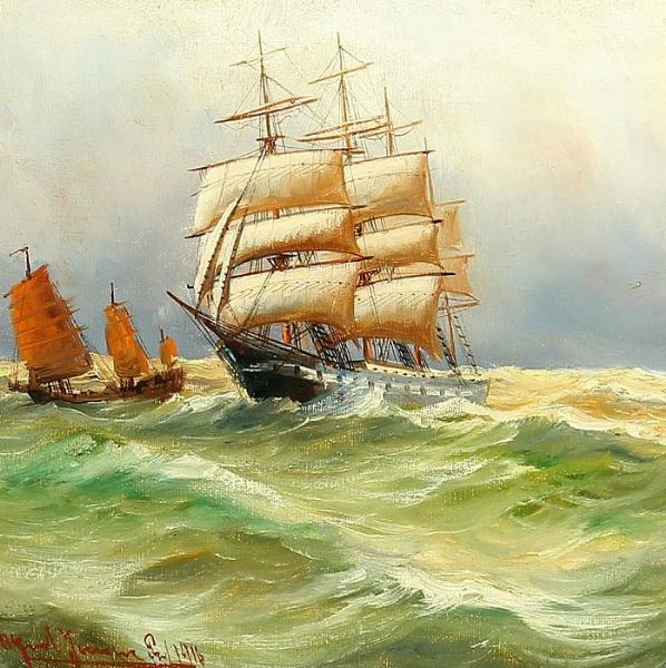 | Seascape with full-rigged ship and sailing ships in rough seas | |