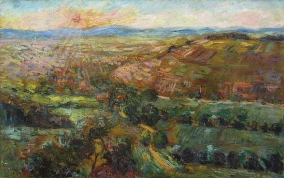 | Hochsommerliche Landschaft am Kaiserstuhl, mit Blick auf den Tuniberg in der Abenddämmerung. | |