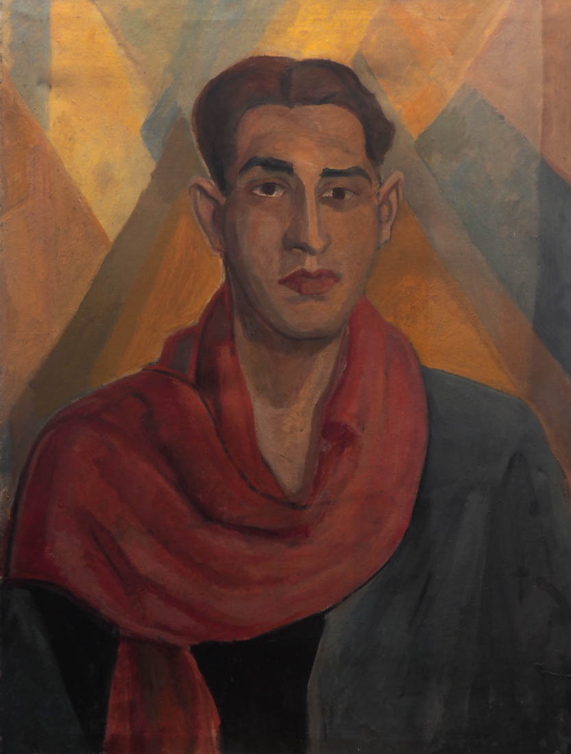 Self-portrait of the artist with a red scarf.