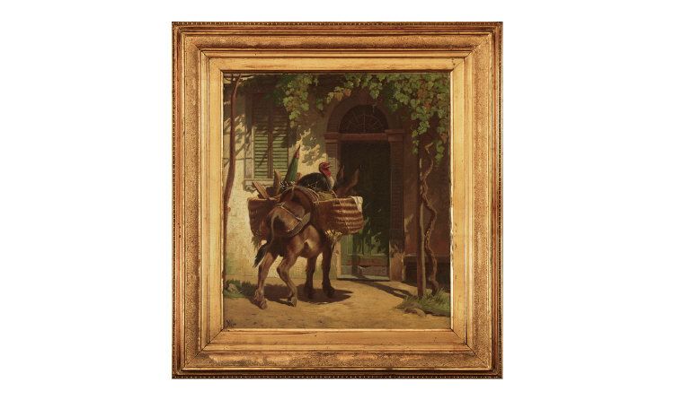 Italian courtyard with a donkey with two paniers on the donkey