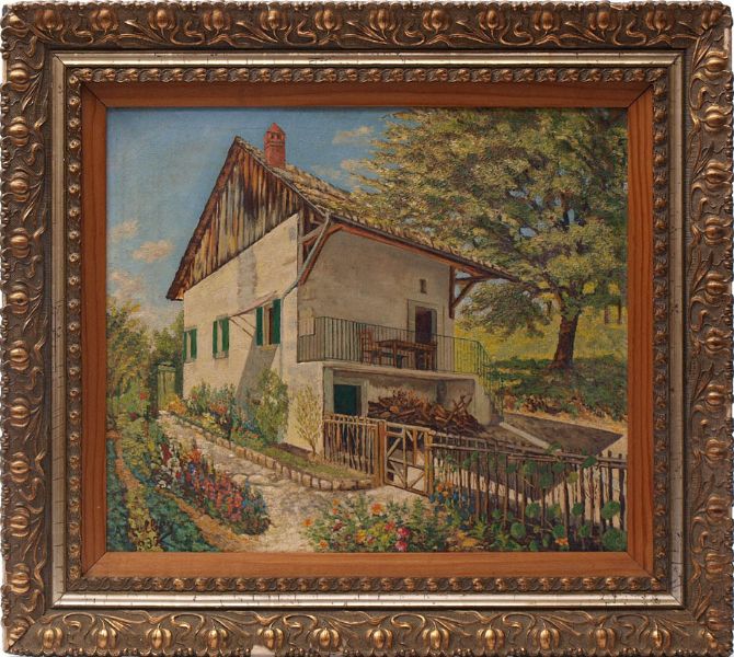 Ansicht eines kleinen Hauses mit Außentreppe unter einem mächtigen Baum