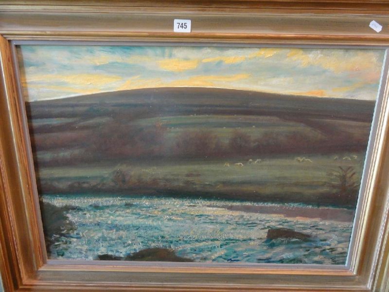 | Brightworthy Fords, Withypool, Exmoor with the river to the foreground, sheep grazing on the fields beyond and with the sun havi | |