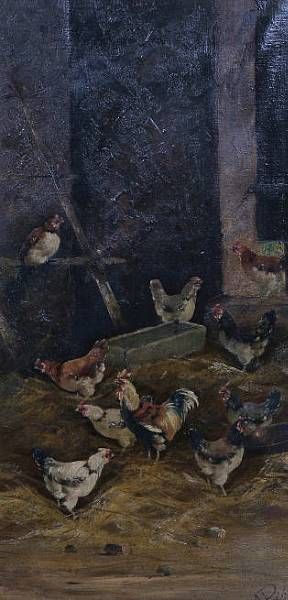 apair of farm scenes, chickens in barns