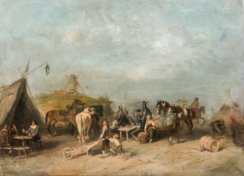 | Feldlagerszene aus dem Dreißigjährigen Krieg. Marketenderzelt und trinkende Soldaten | |