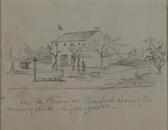| THE OLD PRISON AT BEAUFORT SHOWING THE REMAINS OF THE STOCKS, WHIPPING POST & C... | |