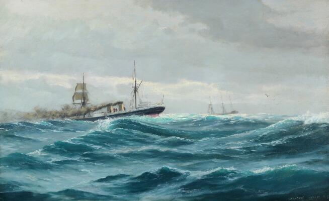 Marine with steamship in heavy seas
