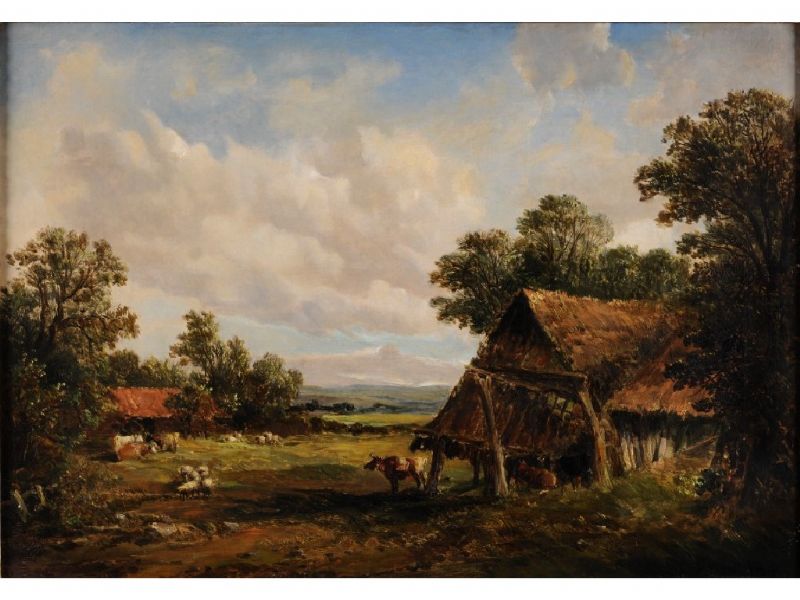 Cattle in a barn, sheep and cattle grazing in the landscape beyond