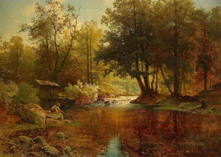 Skogslandskap med fiskande gosse
