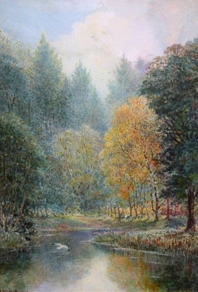A tree lined river landscape with bird