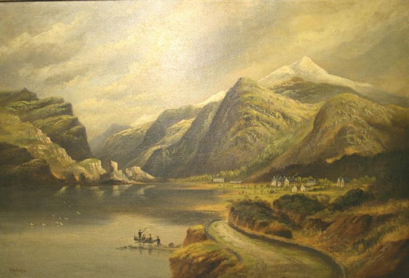 | WELSH MOUNTAINOUS LANDSCAPE WITH TOWER RUIN , a sea inlet with figures in a rowing boat to foreground, a collection of houses be | |