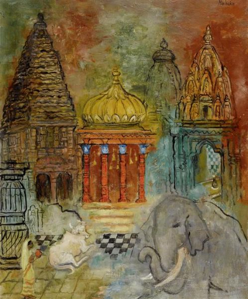 Elephant, cow and woman in front of a temple.