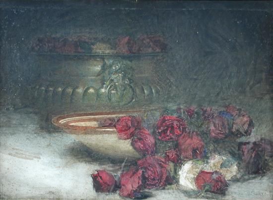 Still life of red roses in an earthenware bowl