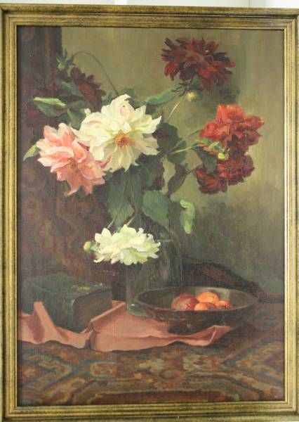 Stilleven met chrysanten en fruitschaal