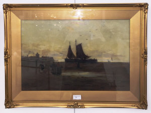 A coastal scene with fisherfolk bringing in their catch