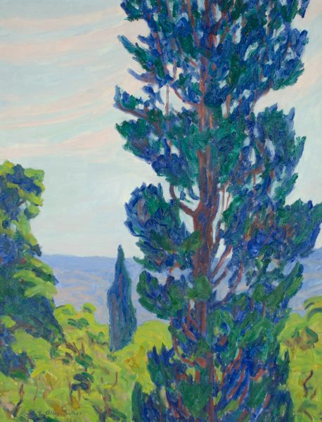| Impressionist landscape with trees in the foreground and hills in the background | |