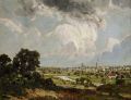 Flusslandschaft mit weidenden Kühen, im Hintergrund eine Stadt
