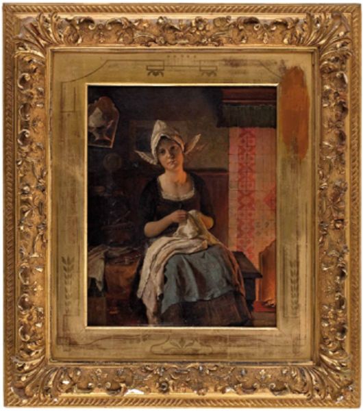 Im Kaminzimmer sitzende junge Frau beim Nähen