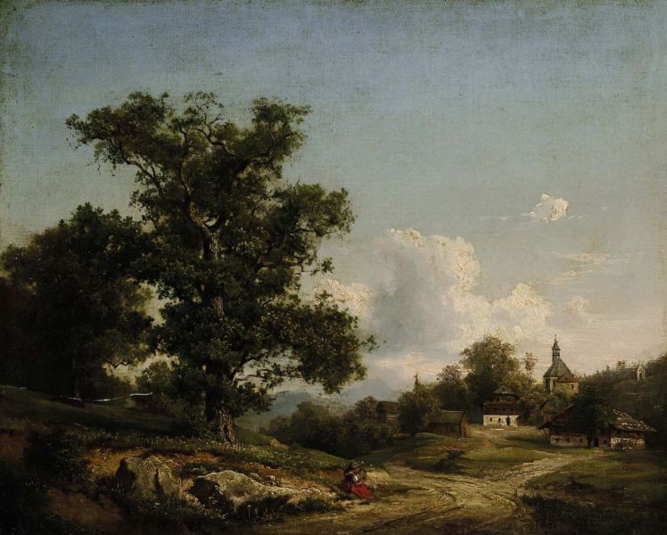 Landschaft mit kleinem Dorf und rastender Bäuerin