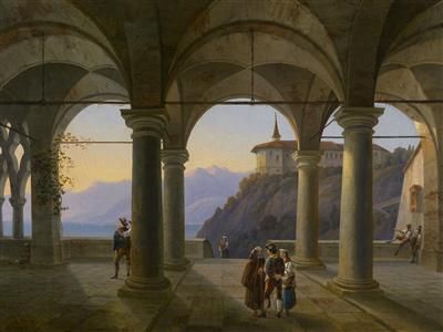 Columned Terrace with decorative figures and View of a Mountain Lake