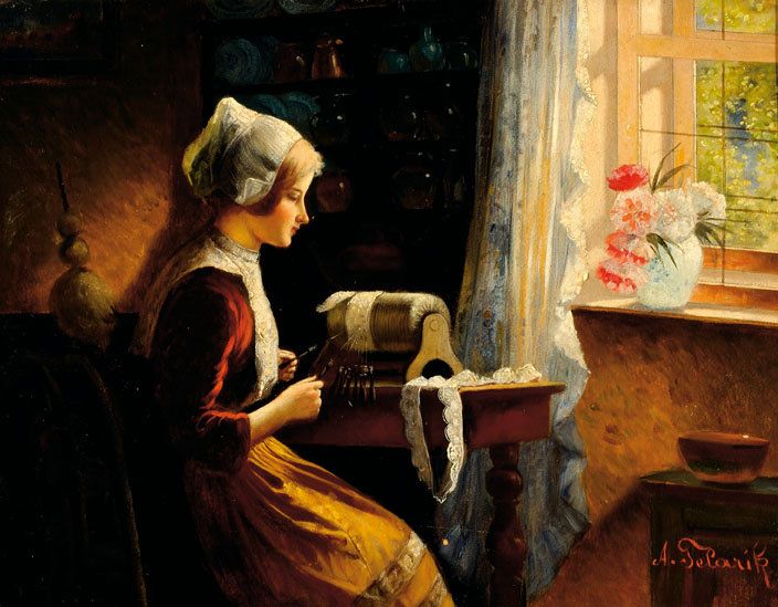 Kantklossend meisje bij venster