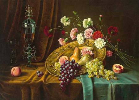 | Magnificent flowering / fruit rummaging in masterly manner. Grapes, pears, peaches and carnations in bowl next to wine glass. | |
