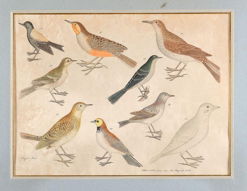 | Planche avec quatre études d'oiseaux et de deux tiges de céréales | |