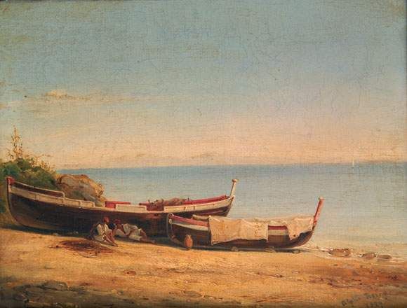 | Barque sur un rivage d'Italie avec deux pêcheurs | |