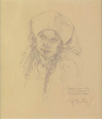 [HEAD OF GIRL WITH BRAIDS.] Pencil drawing