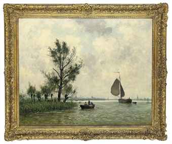 | An extensive river landscape with figures in a rowing boat, sailing boats and a city beyond | |