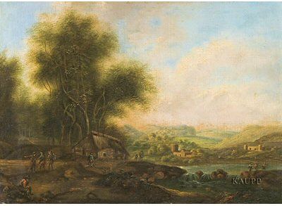 Flusslandschaft mit kleinem Wasserfall, einem Bauernhaus im Schatten eines hohen Baumes und Figurenstaffage am Ufer.