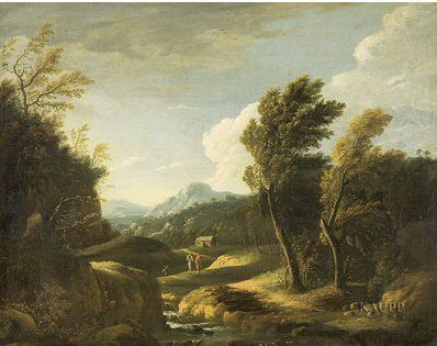 In idyllischer sommerlicher Gebirgslandschaft zwei Wanderer nahe einem Bächlein spazierend.