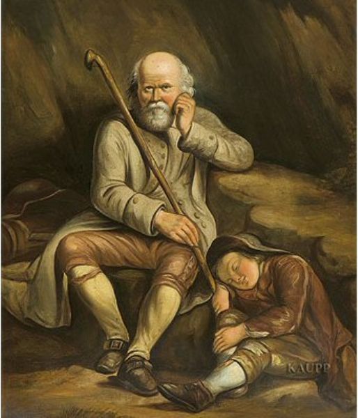 Sitzender greiser Hirte mit schlafendem Knaben.