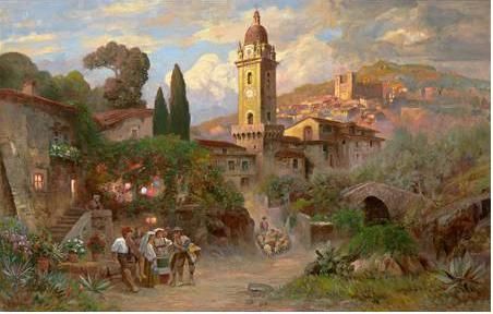 Malerisches italienisches Kirchdorf mit Figurenstaffage und Schafherde