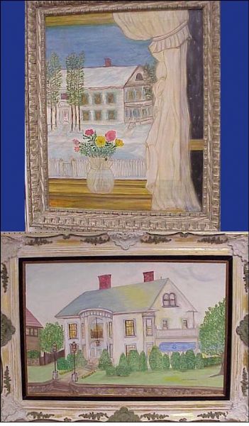 | A winter scene with vase of flowers in front of window with curtain drawn back revealing a home in the snow | |