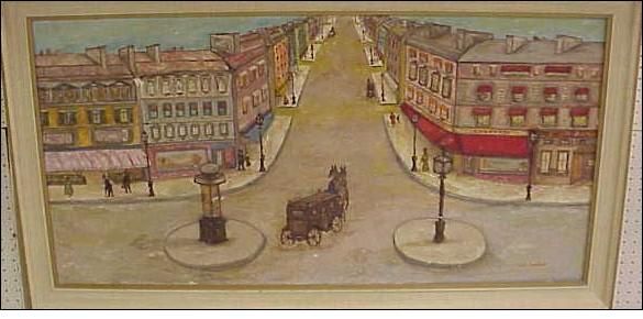 | French street scene with horse drawn carriage and pedestrians on sidewalk | |