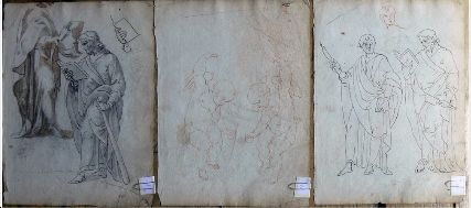 | Trois feuilles d’études recto-verso : personnages en pied, mains et putto | |