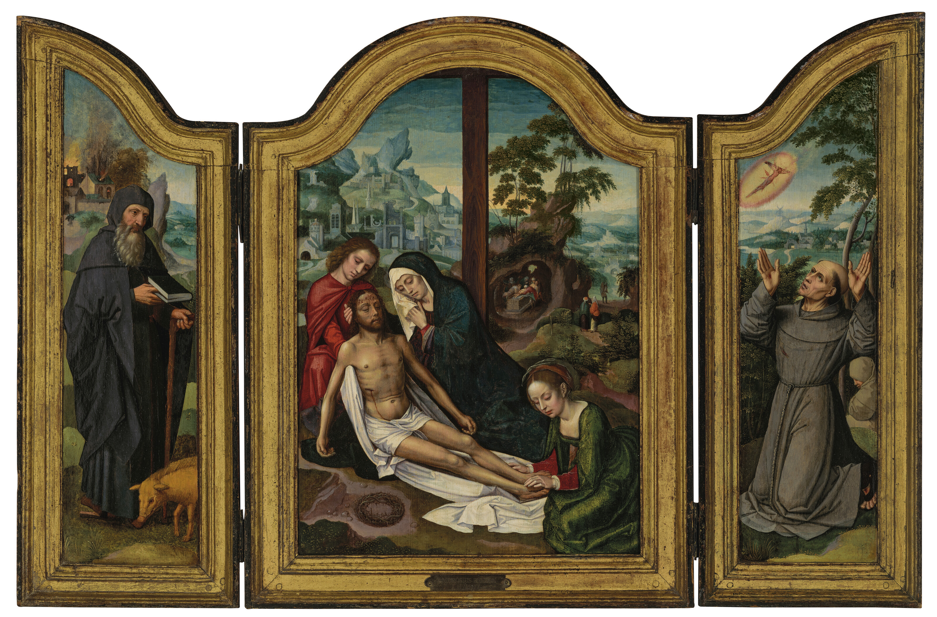 | A Triptych: the central panel: The Lamentation with The Deposition beyond; the wings: Saint Anthony Abbot a burning city beyond; and Saint Francis of Assisi receiving the Stigmata | |