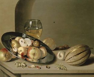 | Apples, pears, peaches and walnuts on a pewter plate with fruit, a roemer | |