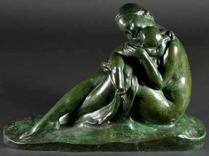| An Art Deco Green Patinated Bronze Figure Group Circa 1925 depicting Mother sat on base caressing her child | |