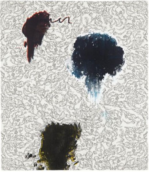 Silkscreen ink on printed fabric