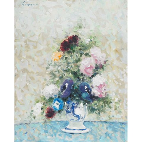 PANSIES AND MIXED SPRING FLOWERS IN A BLUE AND WHITE VASE
