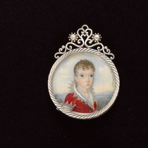 A young Child, in a landscape, wearing a red dress with starched lace collar and sleeves.