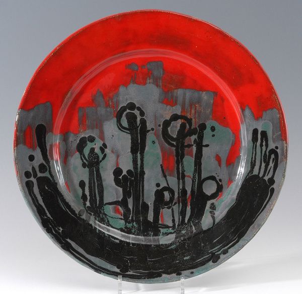 Keramik-Teller. Polychrome, abstrakte Glasur-Malerei.