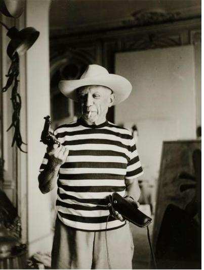 | Pablo Picasso avec le revolver et le chapeau offert par Gary Cooper. Cannes | |