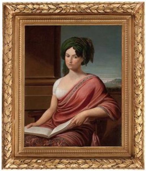 | Sitz-Portrait einer Dame mit Buch (Lady Hamilton?) vor Pfeiler und Landschaftsausschnitt | |