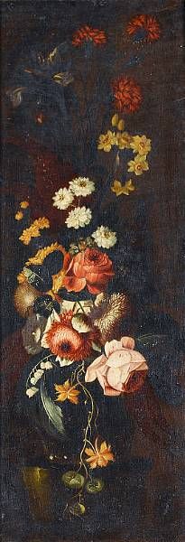 | A still life of carnations, narcissi, roses and other flowers in a glass vase on a stone ledge; and A still life of roses, a peo | |