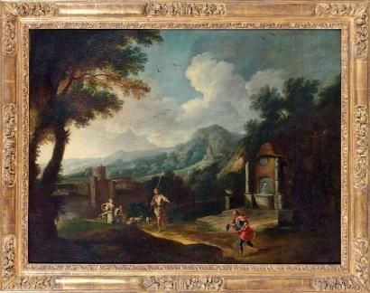 Bergers et troupeau près d'une fontaine