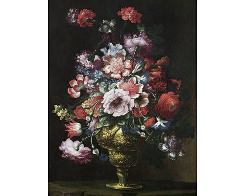 | A still life of roses, peonies, carnations, convolvulus and other flowers in a gold vase on a stone ledge | |