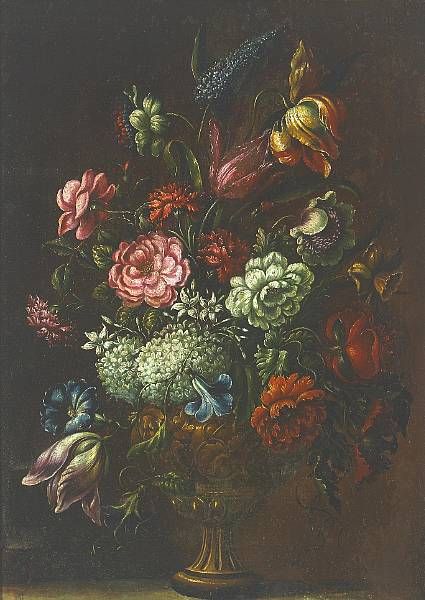 | A still life with roses, tulips and other flowers in a decorated urn; also a companion still life | |